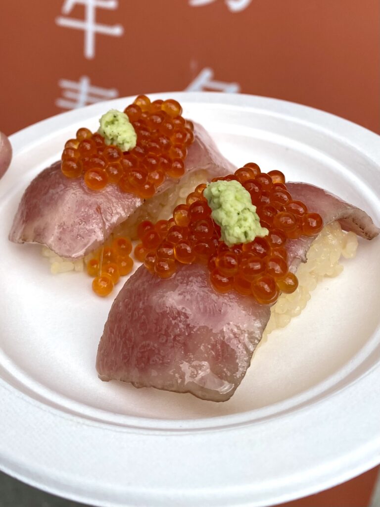 松坂牛にいくらのトッピングをしたとろけるような口あたりお鮨。