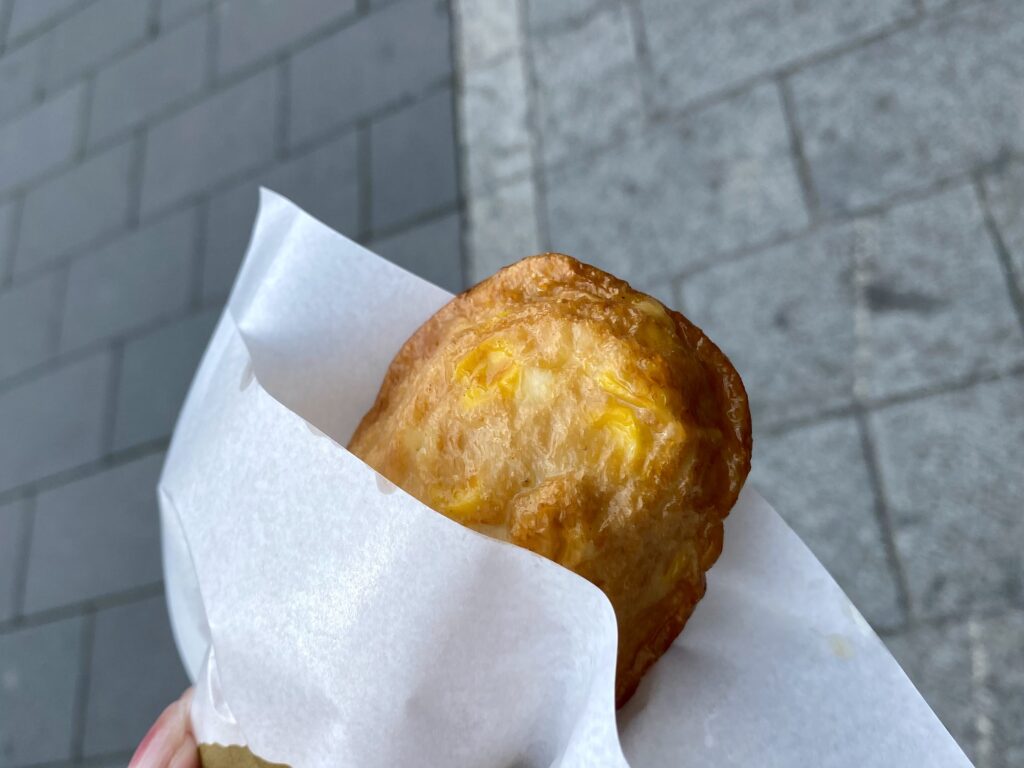 店舗では温かい揚げたてのコーンマヨネーズの磯揚げが売られていたので、即買いしました。