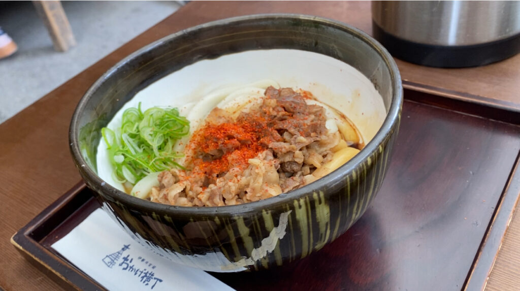 もちもちの太麺に、お出汁の効いた濃い醤油味のつゆを麺にからませながらいただきます。