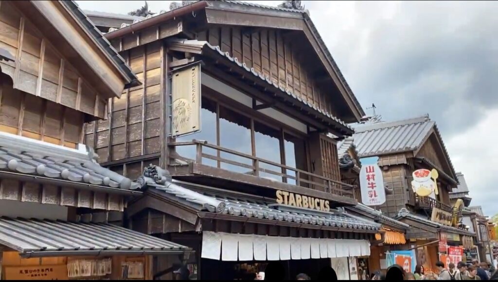 伊勢神宮の参拝後、右手方向を見ると、そこはもう「おはらい町通り」の入口。
