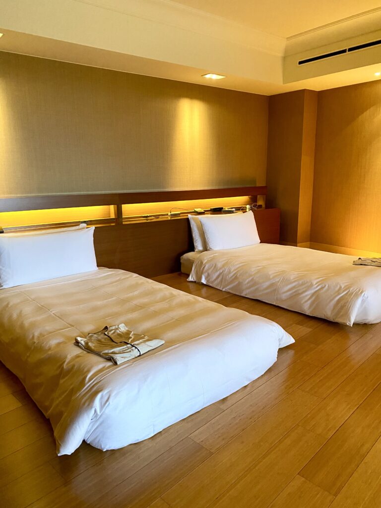 宿泊したFTONスイートの部屋の広さは100㎡。2名~3名がゆったりと宿泊できる部屋で、部屋の名前のとおり、布団のようなふかふかのマットレスで眠れる部屋。マットレス高さは、大人の足首より少し高いくらい。乳児さんは別として、もしお子様が寝ても、落ちて怪我をする心配はなさそうです。
