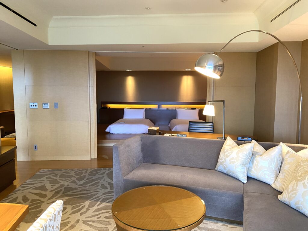 リビング部分も広々としていて、大きなソファとテーブル、出来るビジネスマンが使いそうな大きくて長いデスクと快適な座り心地の回転椅子、アーティスティックなスタンドライトが特徴的でした。
