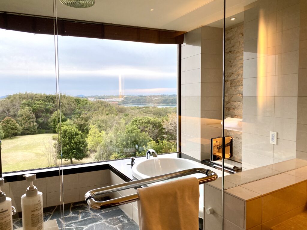 バスルームはガラス張りで、湯舟につかりながら英虞湾が望めます。