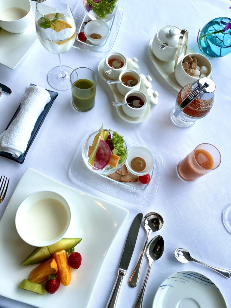 「ラ・メール」の朝食も最高です。白と青のインテリアが、朝の光に溶け込んでいく様子が、とても素敵です。