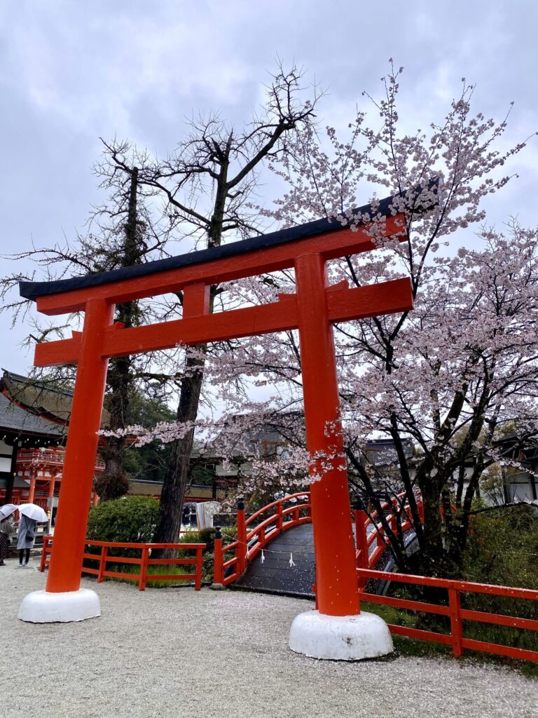 糺の森に包まれた境内に咲く桜は、歴史の重みと静けさを感じさせる春の風景です。