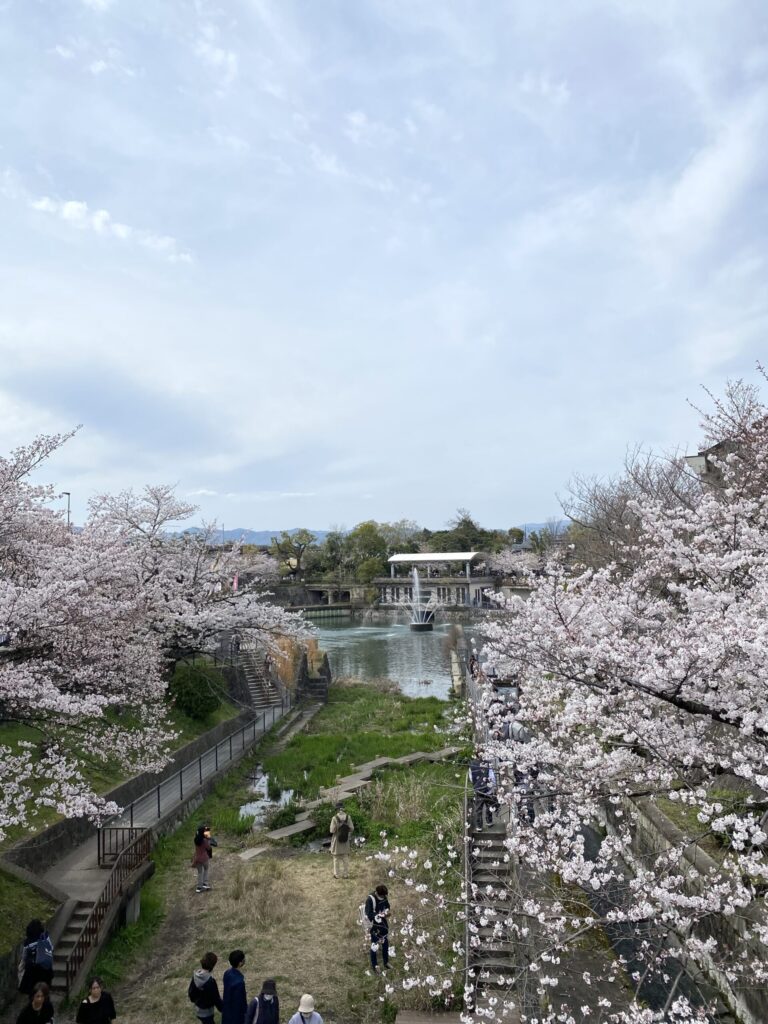 琵琶湖で下船した後は、琵琶湖を背にして、琵琶湖疎水船第一トンネル東口付近を見渡す桜の眺めがとても美しくておすすめ!